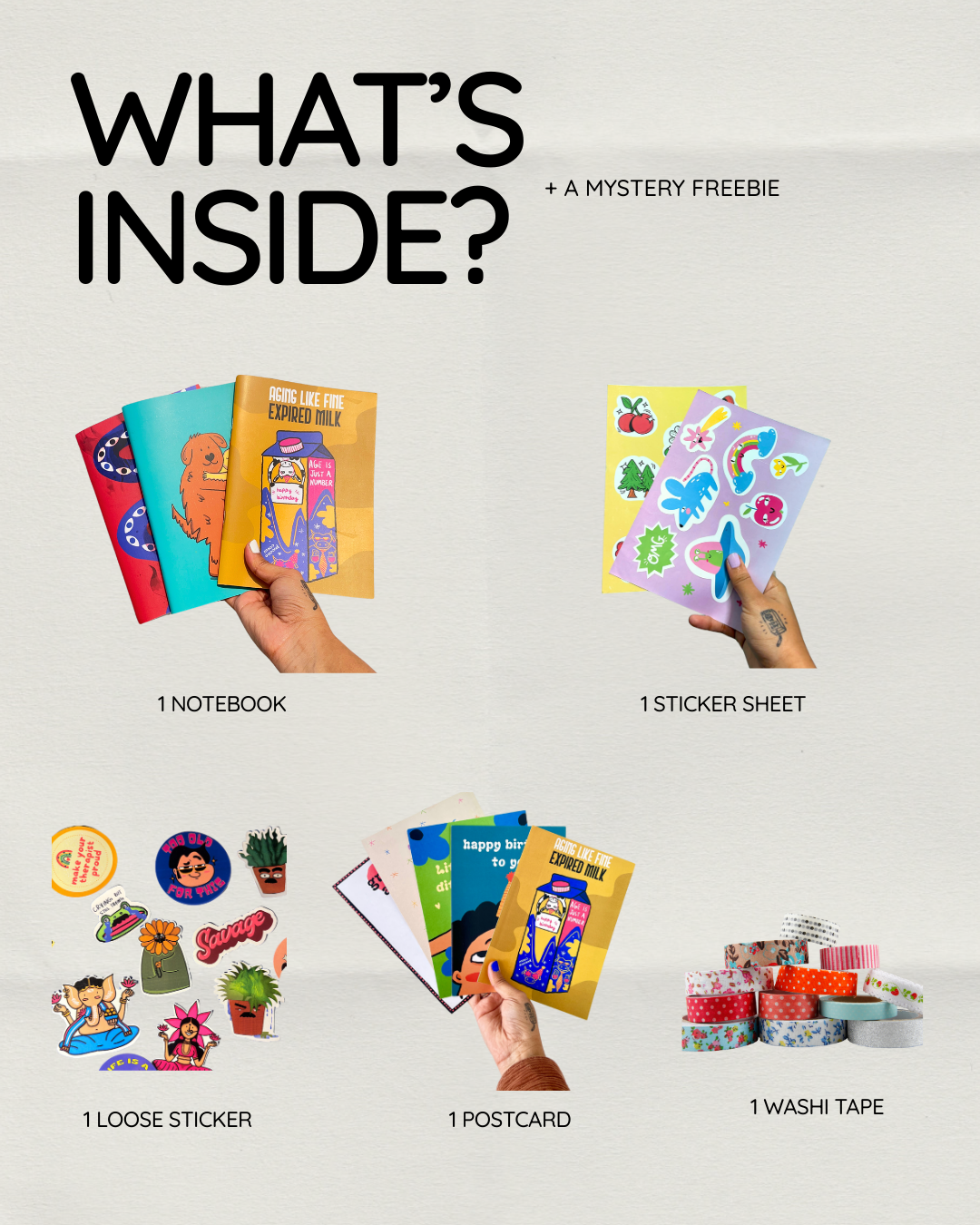 This limited-edition mystery pack includes a notebook and a few stationery goodies — simple, fun, and made with a little chaos (as always).